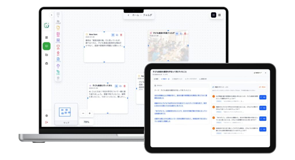 生徒の日々の学びや気づきの軌跡をカスタマイズ性の高いキャンバスビューの中に蓄積します。これまでのテンプレート管理にとどまらずマルチモーダルに対応した次世代型ポートフォリオシステムです。