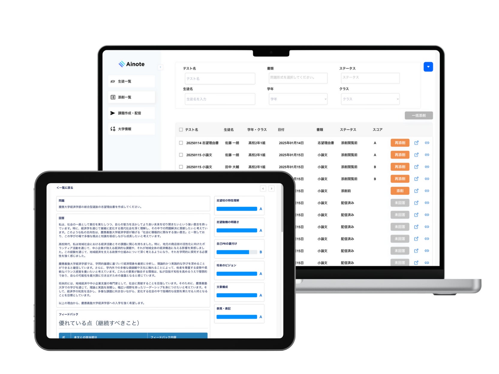Ainoteは、教員の添削時間を削り、生徒に寄り添う時間が捻出されるシステムです。そして、生徒が書いたポートフォリオの内容が小論文や志望理由書の評価に組み込まれることで、その生徒にしか書くことができない文章が出来上がります。