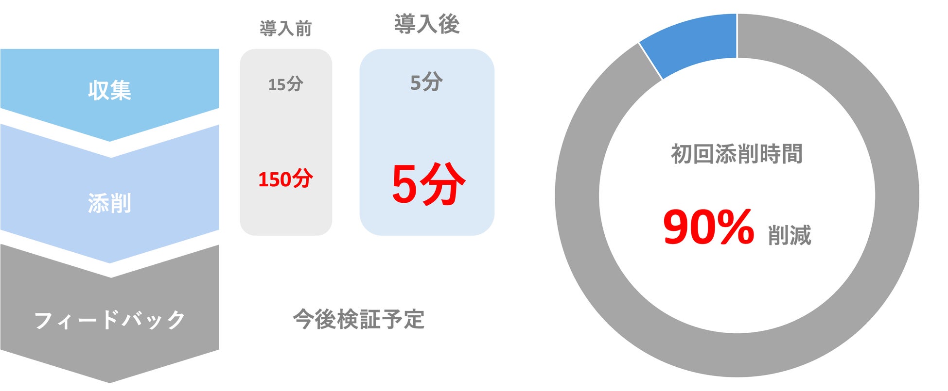 クローズドα版での検証ではポートフォリオの記入から添削までの流れを私立学校の授業にて検証しました。その際には時間内に回答があった11名の添削時間は5分と従来の9割以上の効率化が出来ました。一方で、入力率の低さ等の課題も見つかったため、今後のアップデートで入力ハードルを下げるための取り組みに注力して参ります。