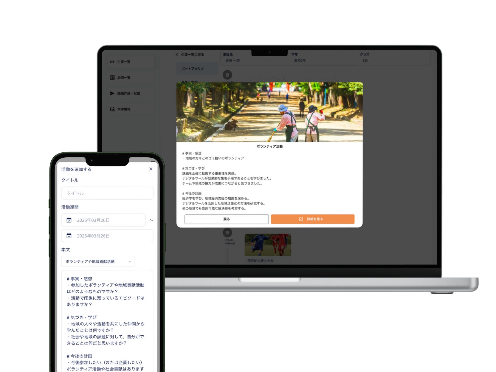 生徒が日々の学びや気づきを、テンプレートを活用しながら簡単に記録できる機能を提供します。蓄積されたポートフォリオデータは、AIによる自然言語処理を通じて文章解析や感情分析が行われ、視覚的にフィードバックを受けることが可能です。